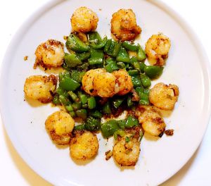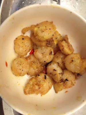 开火,放油,葱炝锅,放入辣椒炒出辣味,再放入虾球翻炒,放少量老抽和盐调味即可