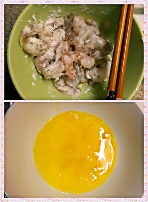 包虾,去虾线,并用淀粉,料酒和鸡蛋裹浆