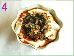 将煮好的豆腐划成薄小块盛在碗里,浇上3料,喜欢的再加点事先炒好的松子、辣椒油、芫荽碎,吃前拌拌即可。