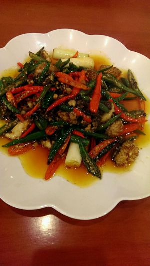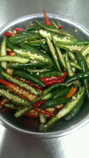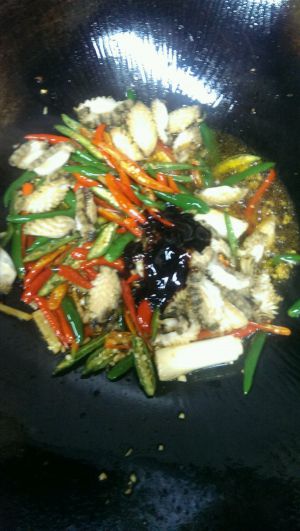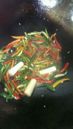 热锅冷油下蒜粒,姜丝,花椒,大葱,豆豉,青红小米椒炒香