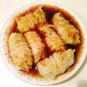 把完整的白菜叶铺平,上面放上肉馅从白菜邦开始裹、一点一点的小心把肉馅都包好,放在盘子里。热水上蒸屉蒸10分钟取出备用。