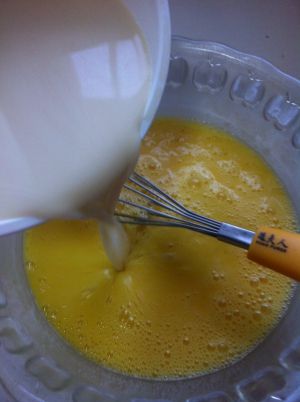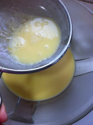加入少许盐,搅拌均匀后过筛,必须过筛、过筛、过筛,重要的事说3遍,这一步灰常不可少,是决定成品口感嫩滑。
