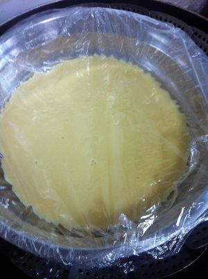 干净的小碗中垫上保鲜膜,把过筛后的蛋液倒入,容器的一半量,上面再用保鲜膜封住,以免水蒸汽进入。