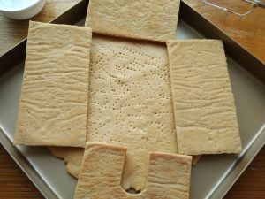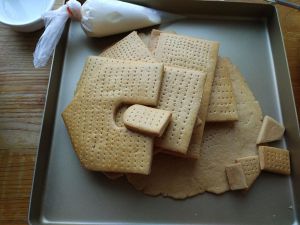 在底座上开始“盖房子”了。首先拼装底部,用糖霜把相应的饼干如图所示粘起来。