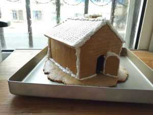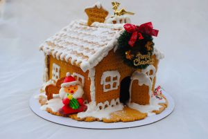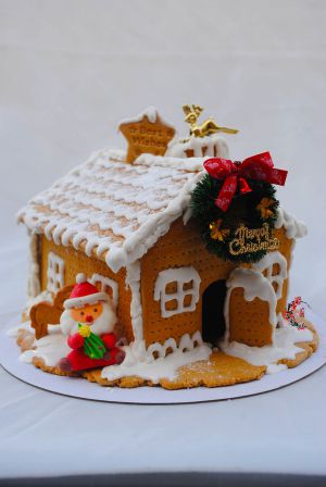 最后拼上屋顶和烟囱,再在四周底下挤上糖霜,待饼屋干后,才可以移动。根据自己的喜好,装饰姜饼屋。