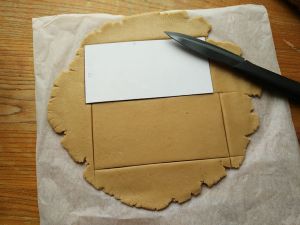 松弛好的面团,放在案板上擀成厚约0.3CM的薄面片。把剪好的纸片模型放在面片上,用刀依模型的边缘切割出图案。