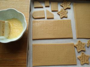 把切割好的面片放在烤盘上,子用叉子扎一些孔(也可不扎),刷一层蛋水液,静置松弛10分钟左右,再刷一层蛋水液。烤箱160度上下火预热8分钟。