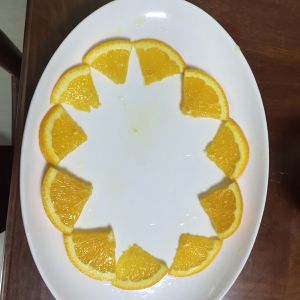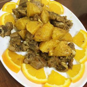 放橙子块进去翻炒。建议还是用橙汁比较好。因为橙子肉比较软,影响卖相。橙子又解油腻,这样摆盘有橙子,中间只用橙汁的排骨,摆盘更好看,