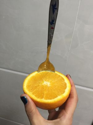 取橙子肉技能,切一半,然后用勺子转一圈,或者两头切了,用勺子转一圈,接着切块。