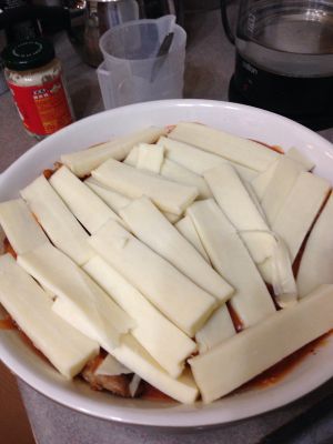 然后铺上芝士。我用的是mozzarella 整块的芝士,切片后放上去。可以随意加自己喜欢的芝士。