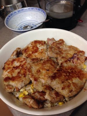 腌制好的猪扒沾少许蛋浆,再扑上面包糠。然后热锅放少许油将猪扒煎到半熟,两面金黄。