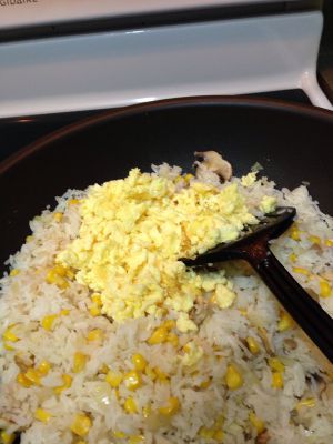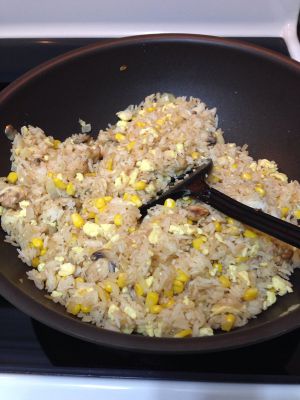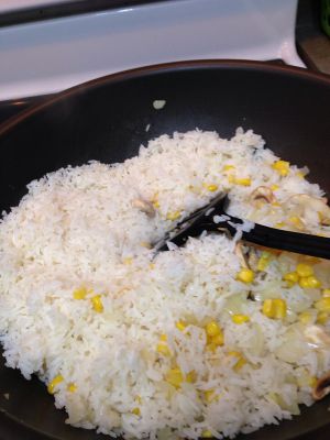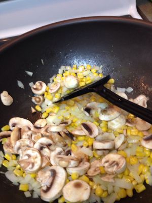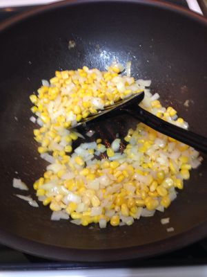 热油锅将洋葱炒香,再放玉米粒炒匀。