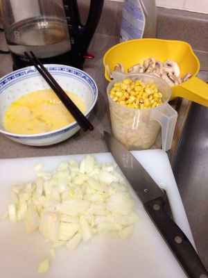 鸡蛋打好,将洋葱切碎,蘑菇切小块等备用。