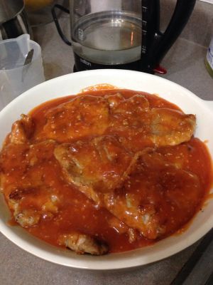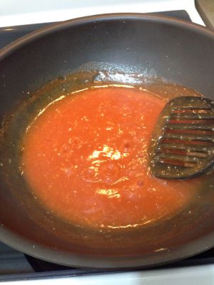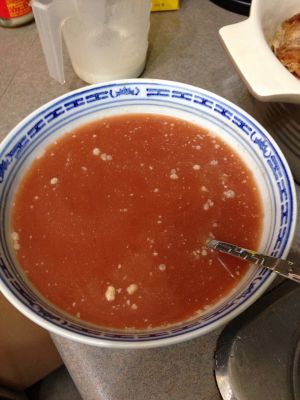 调一个酱汁:一杯的蕃茄酱、一杯半的高汤、少许糖。