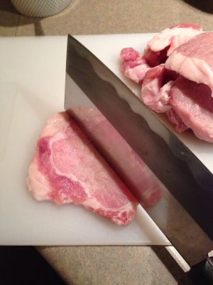 将猪扒用刀背拍松软,两面都要拍,横竖交叉地拍。