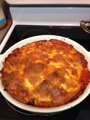 烤箱预热220度,烤20~25分钟,上面的芝士烤得焦黄就可以了。