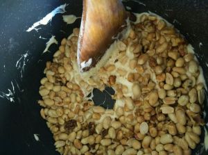 搅拌,让花生和芝麻全都粘到糖里,这里要花点力气