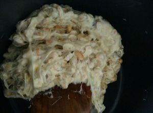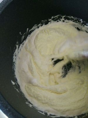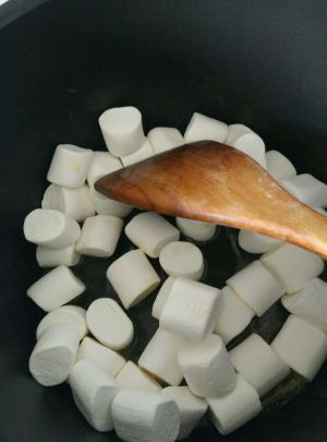 加入奶粉继续搅拌,直到棉花糖和奶粉融合成糖团