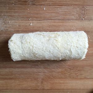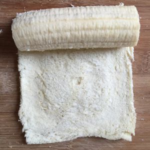把香蕉卷起来,尽可能的卷紧一些。避免后面煎时候散掉