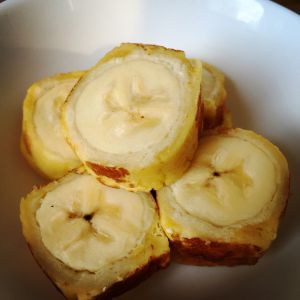 香甜可口的香蕉鸡蛋吐司卷就做好啦。PS:一周岁以下宝宝要用核桃油。适合有一定咀嚼能力的宝宝哦。