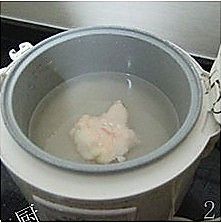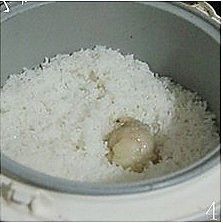 电饭锅内放入大米和水,再放入一块鸡油(和平时煮饭一样,只是多加了一块鸡油而已)。
