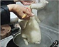 在处理干净的文昌鸡胸腔内和鸡身上均匀的抹上一层簿簿的食盐,稍为按摩一下,锅内放水,将整只文昌鸡放锅内,开大火煮。