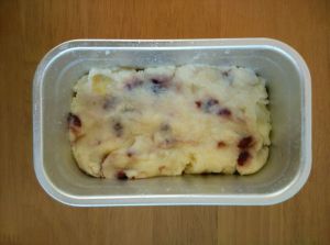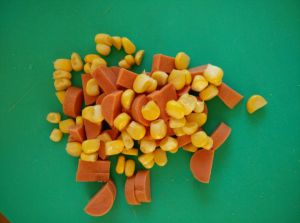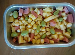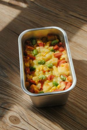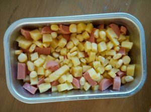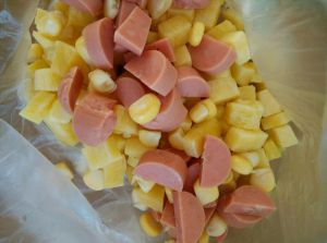 土豆去皮切小块煮至筷子轻易插过,加入适量牛奶捣烂成泥,稠的程度以成团为主。加入切碎的蔓越莓干和10克细砂糖拌匀备用。火腿肠切丁,玉米和青豆洗净
