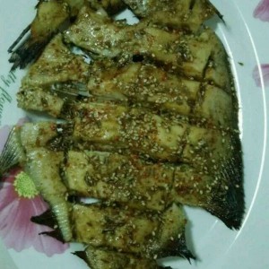 烤架刷一层油,把鱼小心移到烤架上,然后刷油,烤到不淌汁时撒上孜然 芝麻 辣椒粉继续烤十分钟左右,如果你爱吃焦一点可多烤一会