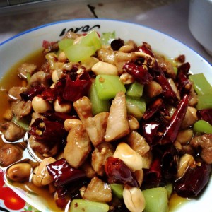 中火下辣椒,大蒜,花椒,然后把鸡丁倒入,稍微翻炒片刻,铲出来,倒入青笋翻炒,然后再将鸡丁返回去,加入花生,一点点酱油,适量盐,味精,鸡精调味。出锅。
