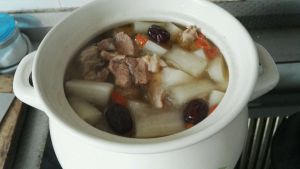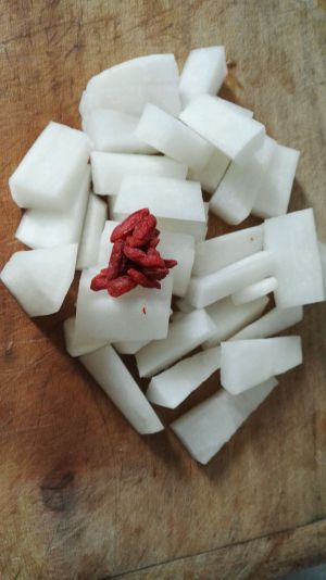 白萝卜切块,等汤煮到一个小时的时候,把白萝卜、枸杞放进去。