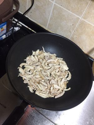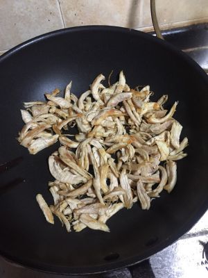 锅烧热,放少量食用油,鸡丝倒入,小火轻炒。