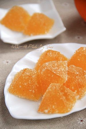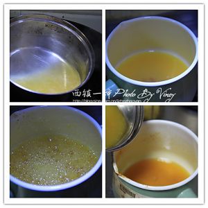 一直煮到温度到118度左右关火放凉,如果没有温度计的话,用筷子沾一下糖浆,然后滴到冷水里,直接可以凝固就可以了。然后将糖浆放到70度左右,再倒入刚才的橙汁吉利丁液,混合均匀了。