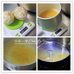 然后剩下的橙汁里放入麦芽糖和细砂糖,直接中火加热熬煮。