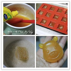 糖果定型好之后(我大概放了一夜),然后将软糖取出来,为防止黏连,我又在外面滚了一层细砂糖防粘,最后一张是维尼熊的糖果。这时候就可以吃了。