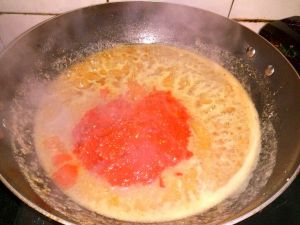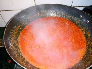 加入辣椒酱,盐,搅拌均匀,小火慢熬