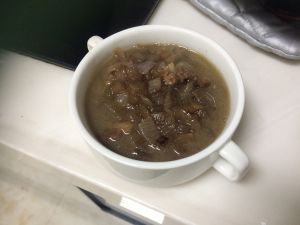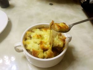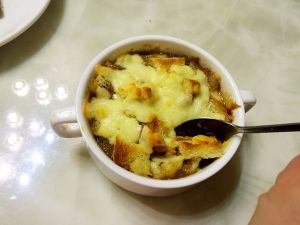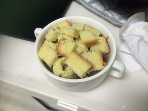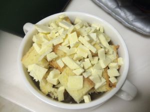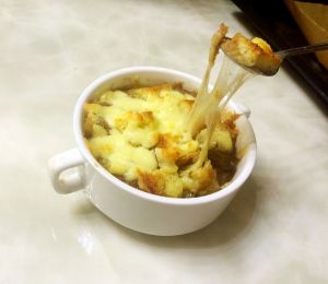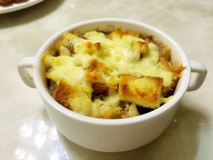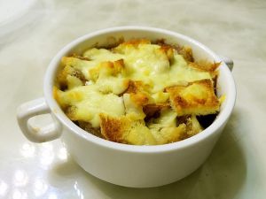 将白吐司切成小块,送入烤箱180度烤6分钟。然后将吐司块放在洋牛肉葱汤上。