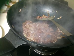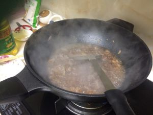 待洋葱炒至金黄透亮,倒入25g红酒,翻炒。