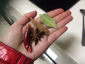 加入大蒜、香叶(月桂叶)、桂皮、干辣椒。法式牛肉一般放迷迭香和月桂叶之类的,家里只有中式的牛肉香料。可以不放茴香,茴香有一股浓浓的中式风格!