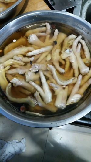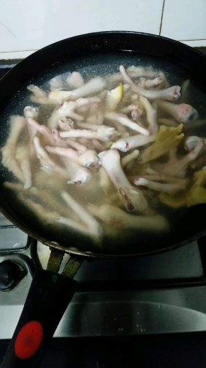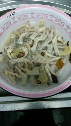 焯水后的凤爪煮开后,再煮五分钟后取出煮好的凤爪倒入(冰)水中!没有冰水就直接放凉水中就好了!泡10分钟