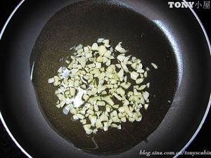 先热锅。倒入橄榄油。放入蒜末煸炒出香味。