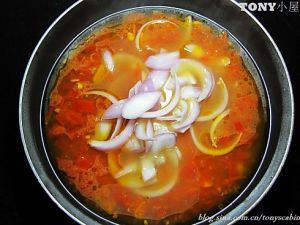 加入切好的洋葱(其实洋葱也可以和番茄一起煸炒再放水),大火煮开后中火烧20分钟。