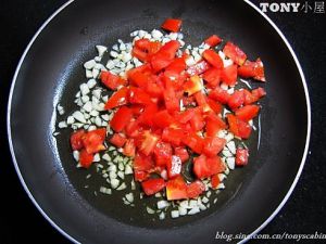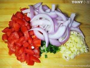 先把材料处理一下,番茄切成丁,洋葱切成丝,大蒜用刀背压一下切成蒜末。