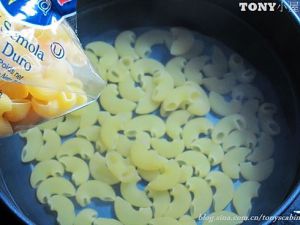 事先先在汤锅里把水煮开然后放入意大利面条,再放点盐,根据对面条软硬的喜好自己掌握时间,但意大利面条其实不是很容易煮烂的,正宗的意大利面条都是吃起来里面有点生的,我们中国人大都吃不惯,所以我们加点盐么可以多煮一会也可以入味。煮好后,滤干水,放在盘子里。