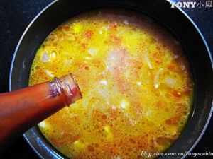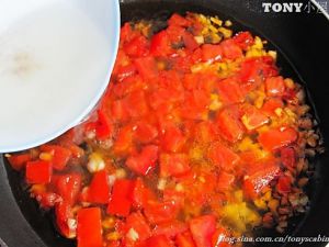 加入盐。加入鸡精。最后倒入番茄汁让汤水变的稍微再浓稠一点但不能是干的感觉,这样就把酱汁做好了。