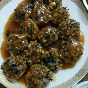 豆腐泡切成两半,掏出里面的豆腐,酿入馅上锅蒸十分钟