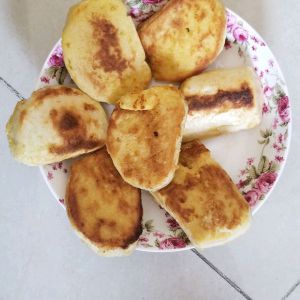 热锅凉油 馒头片沾取蛋液放入锅中 中小火煎至两面金黄色出锅 剩余的蛋液倒入锅中摊个鸡蛋饼。