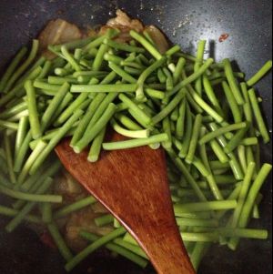 起锅加味精,盐自己掌握。蒜薹不容易熟,可加水闷一下。