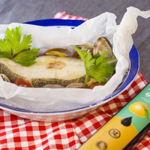 接着将鱼肉,蛤蜊,小番茄,大蒜片,淋料酒和橄榄油,铺在烹饪纸上