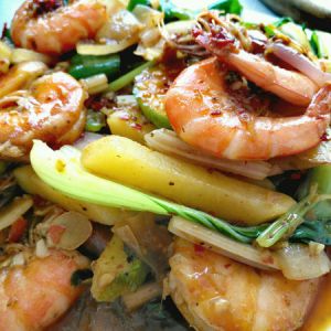 将佐料炒熟后放入炒虾料包,再放入炒好的虾,不断翻炒。