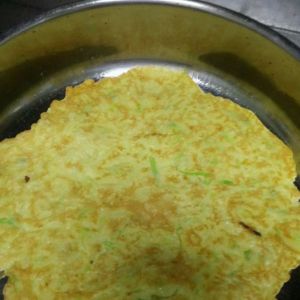大约两分钟左右,平底锅拿起来晃动几下,让饼可以晃动。底面金黄色之后可以翻面继续。(翻面是个技术活,我第一次做两张之后才翻出完整的。多实验一定成功)